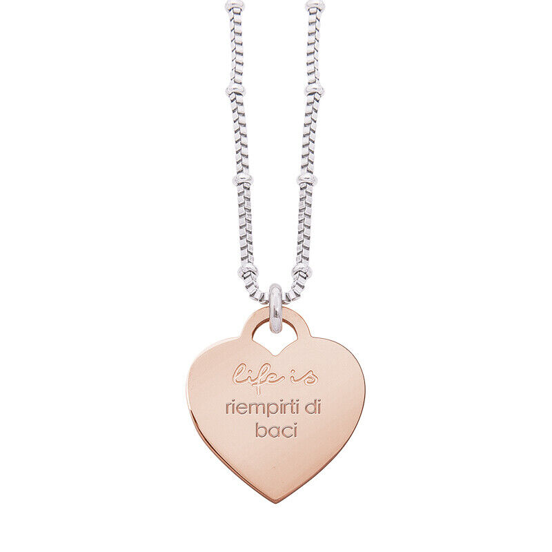 Collana Life Is Love in acciaio rosato, medaglietta in acciaio con frase incisa riempirti di baci