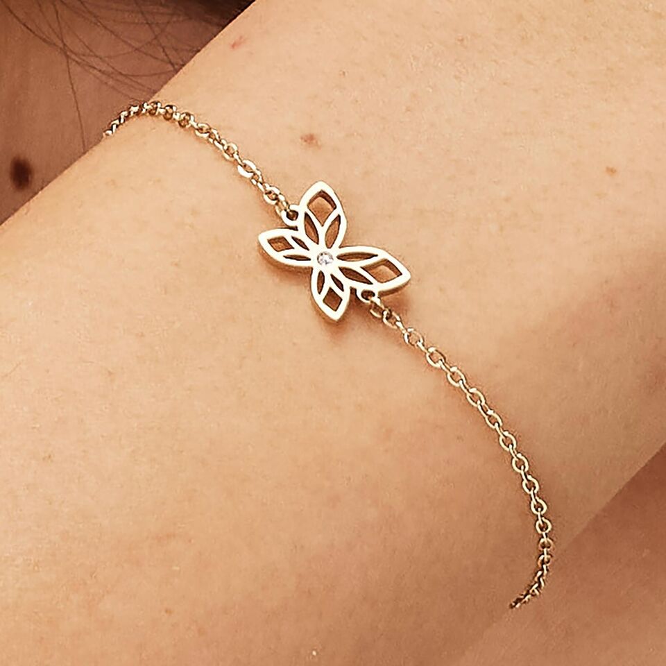 Bracciale in acciaio 316L e finitura pvd oro 14k con catena farfalla e cristallo