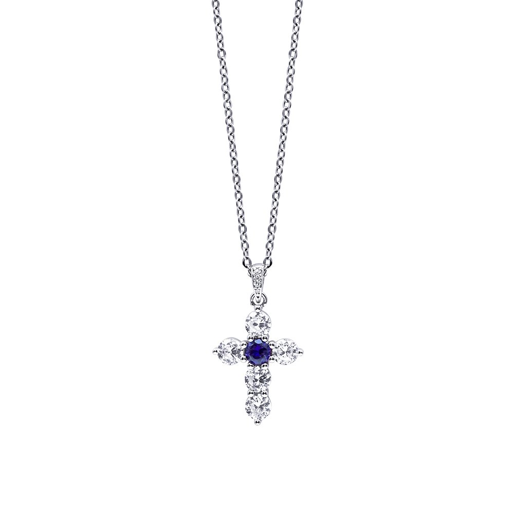 Ciondolo croce in argento 925‰ rodiato e zirconi bianchi e blu con catenina in acciaio inalterabile