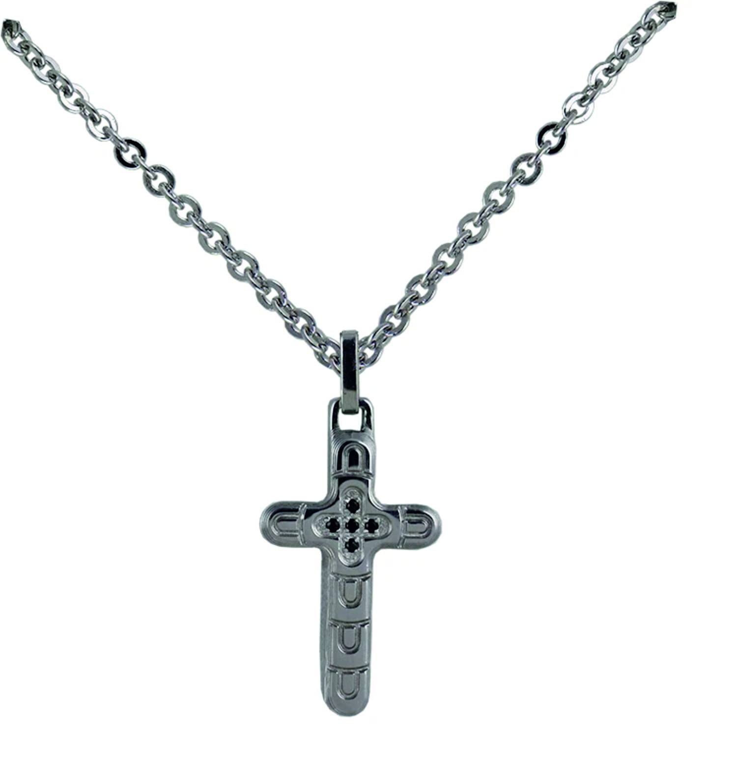 ciondolo croce in acciaio pvd e spinelli neri